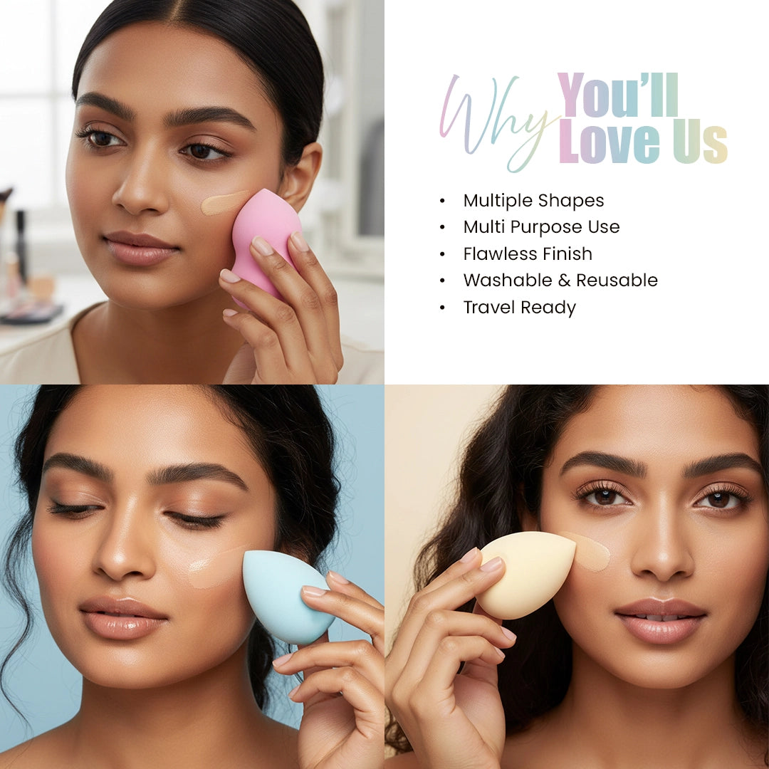 The Perpaa Beauty Makeup Blender Set includes three uniquely shaped makeup sponges, each designed for different makeup needs—full-face blending, seamless base application, and precision detailing. Made from soft, hydrophilic polyurethane, these sponges expand when wet to deliver smooth, even, and flawless coverage.